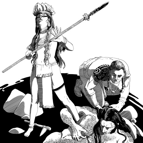 I was tangled in Tínima’s naked arms, our marriage consummated but hours before and was still more than a little drunk when the screaming began. Staggering to my feet, I grabbed my paddle-axe and knife, told my new bride to remain hidden in the hut, and rushed out to see what had befallen us.
