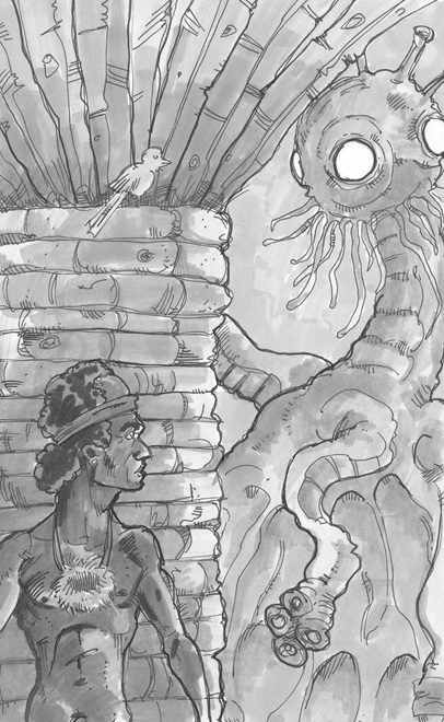 He followed the track, wound around the strange woods on it, and crossed another odd bridge. He could hear the clacking, louder now, and closer, and as he came around a wide curve in the trail he knew whatever it was could not be far. Ducking off the path he pressed himself to the braided bark of one of the barrel-trees. He peeked around and froze at what he saw.