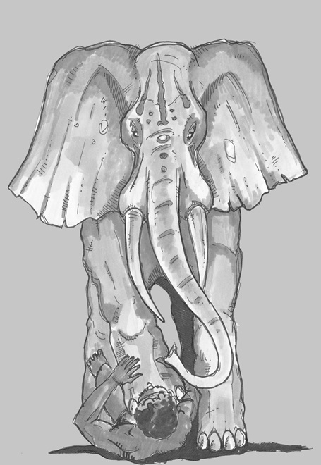 Tears-the-Vine bent her head and wrapped her trunk around a great half-buried tree-branch. Wrenching it free in a spray of dirt and sand she stood with it and gazed at them.